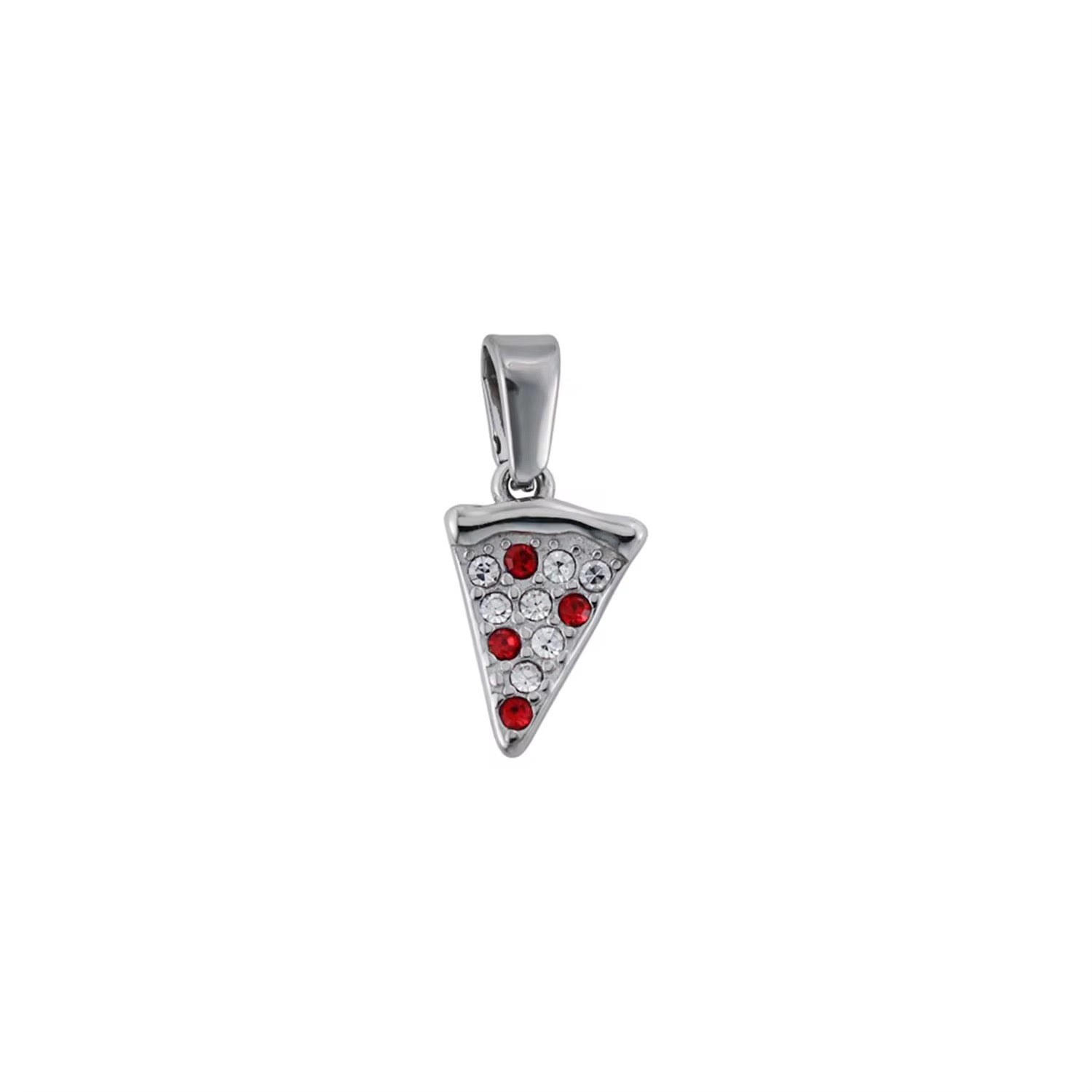 Fun pizza slice charm topped with sparkling red and clear crystals — the perfect accessory for pizza lovers and playful jewelry styles.